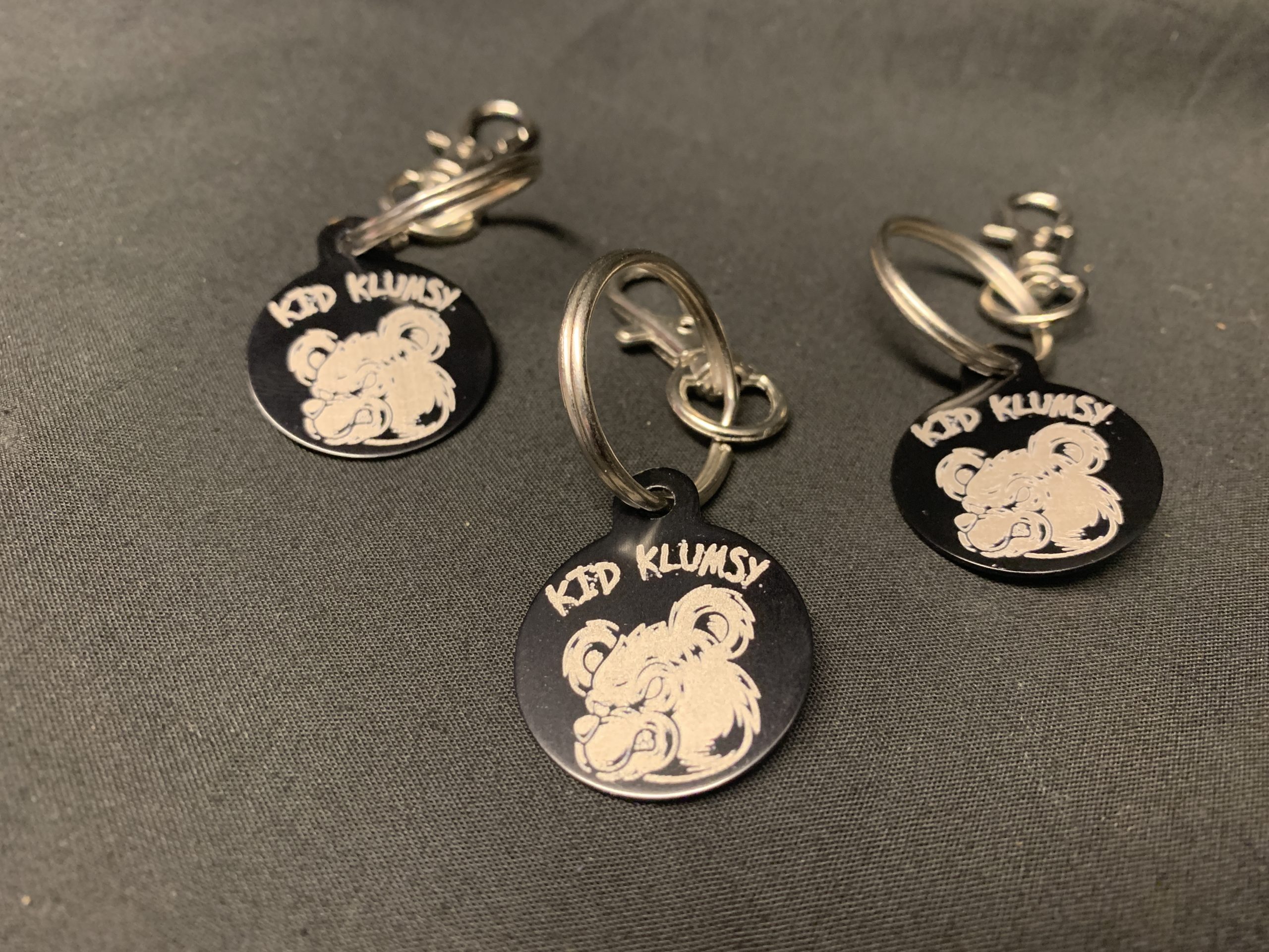 Round Metal Key Ring, laser engraved with the Kid Klumsy Logo, with split ring and lobster clasp.