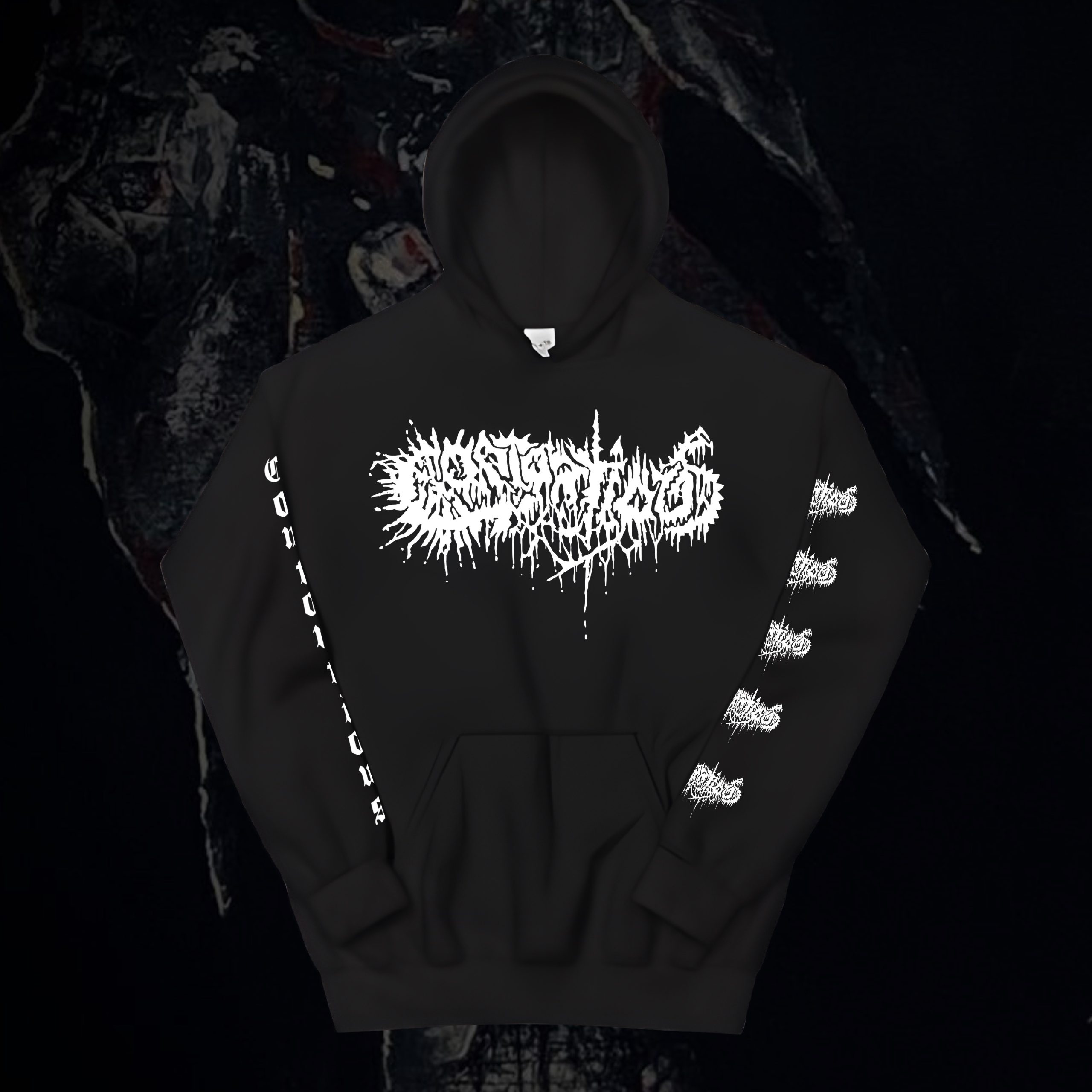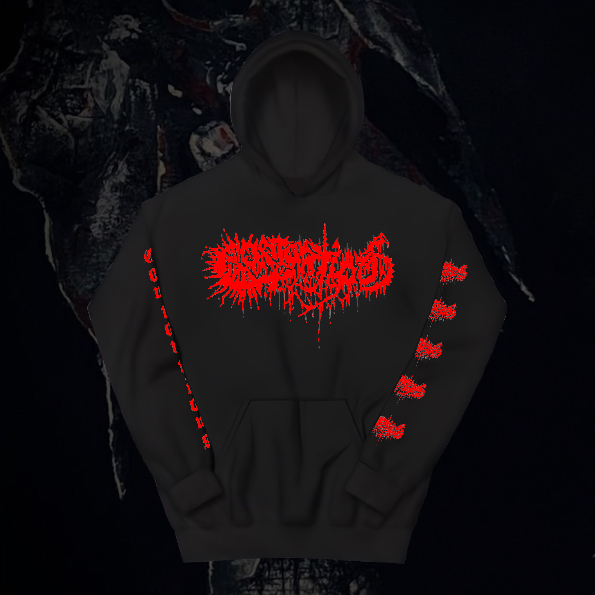 A Hoodie with the Contortious design in Red on the front breast, full back and arm.