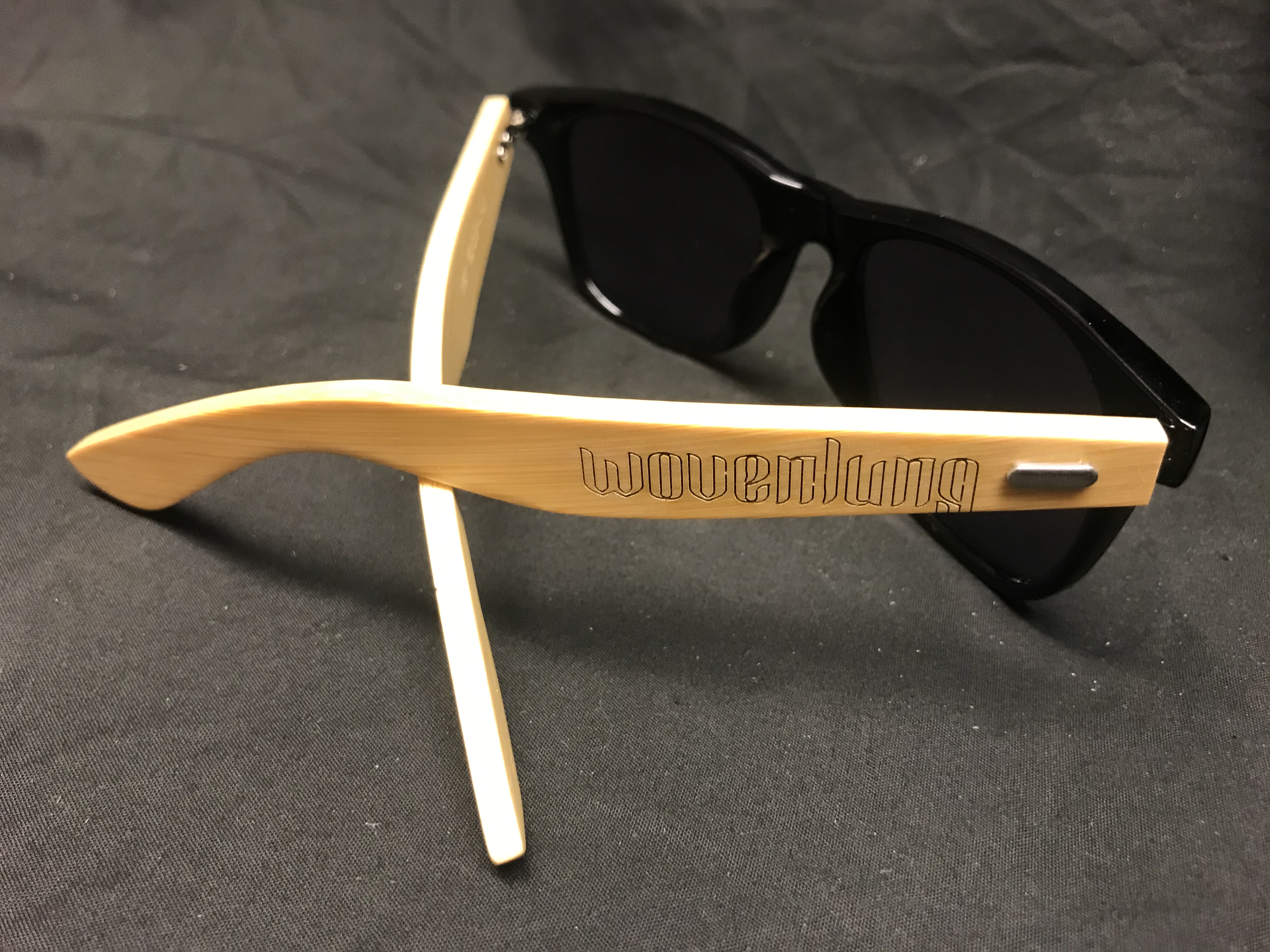 A pair of Custom Engraved Sun Glasses with the Wovenlung logo.